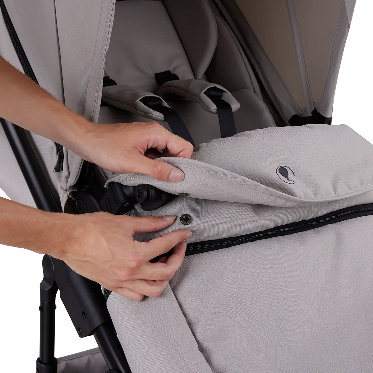 Die Befestigung erfolgt sicher am Schutzbügel und an der Fussstütze. Dadurch sitzt die Beindecke stabil und verrutscht nicht während der Fahrt. Sie passt auf alle ABC Design Kinderwagen und Buggys und integriert sich harmonisch ins bestehende System. Der integrierte Reissverschluss im oberen Bereich ermöglicht eine Verlängerung um etwa 10 Zentimeter. So wächst die Beindecke mit und bleibt über mehrere Entwicklungsphasen hinweg nutzbar.