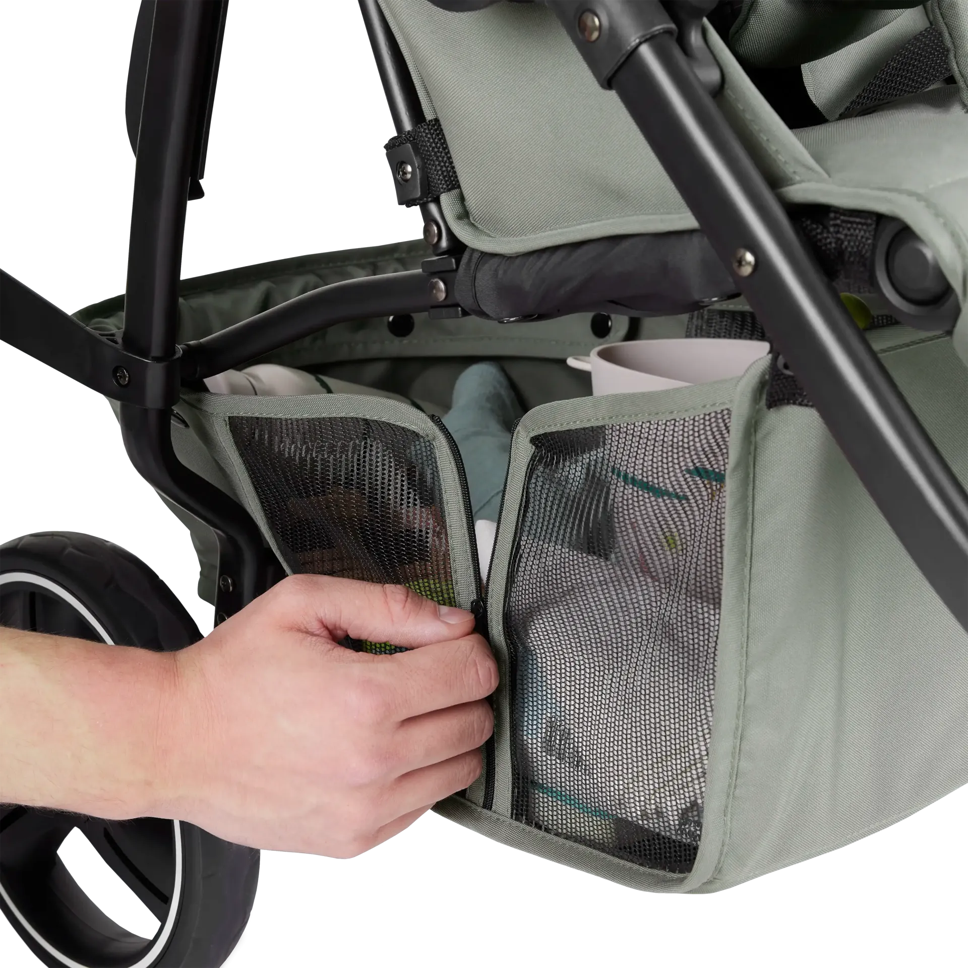 Auch im Alltag zeigt der Kinderwagen praktische Stärken. Zwei große Einkaufskörbe bieten viel Platz für Einkäufe, Wickelsachen oder Spielzeug. Der Einhand Faltmechanismus erleichtert das Zusammenklappen, wenn der Wagen im Auto verstaut werden muss oder zu Hause wenig Platz vorhanden ist.