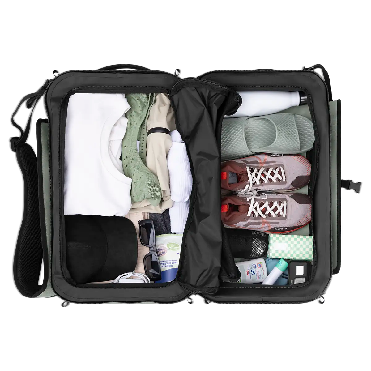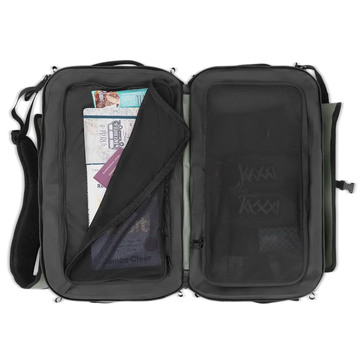 Das große Hauptfach ist in zwei Hälften geteilt und jeweils mit Netztrennwänden und Reißverschluss ausgestattet. Eine Seite verfügt über eine zusätzliche Netztasche, die andere über eine flexible Zwischentasche. So bleiben Wäsche, Dokumente oder Technik sauber getrennt und schnell griffbereit.