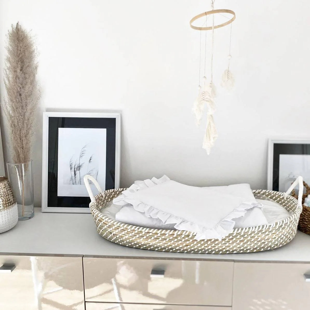 Du platzierst es auf einer Kommode, auf dem Bett oder direkt auf dem Boden. So entsteht überall ein definierter Wickelbereich ohne zusätzliches Möbelstück. Die weiche Einlagematte sorgt für angenehmen Liegekomfort und macht das Körbchen sofort einsatzbereit. Das natürliche Seegras bringt Ruhe in den Raum und fügt sich harmonisch ins Babyzimmer ein.