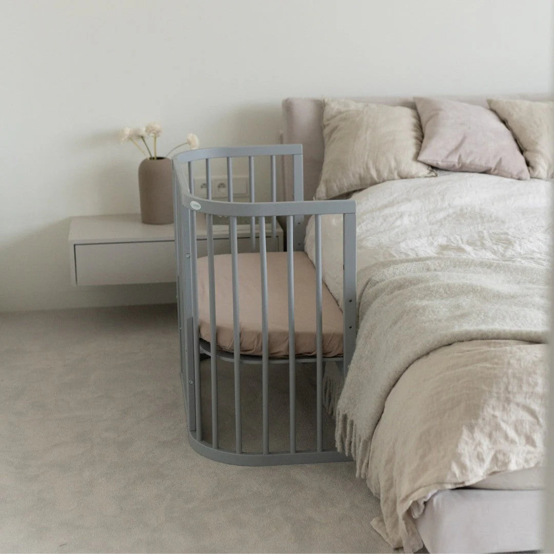 Die Konstruktion aus massivem Holz sorgt für Stabilität über mehrere Jahre hinweg. Rollen mit Feststellfunktion ermöglichen flexible Platzierung im Raum und sicheren Stand im Alltag. Die quadratische Form nutzt den verfügbaren Platz effizient und fügt sich harmonisch in verschiedene Wohnstile ein. Dieses mitwachsende Babybett reduziert Mehrfachkäufe und schafft einen vertrauten Ort, der sich konsequent an die Entwicklung deines Kindes anpasst.