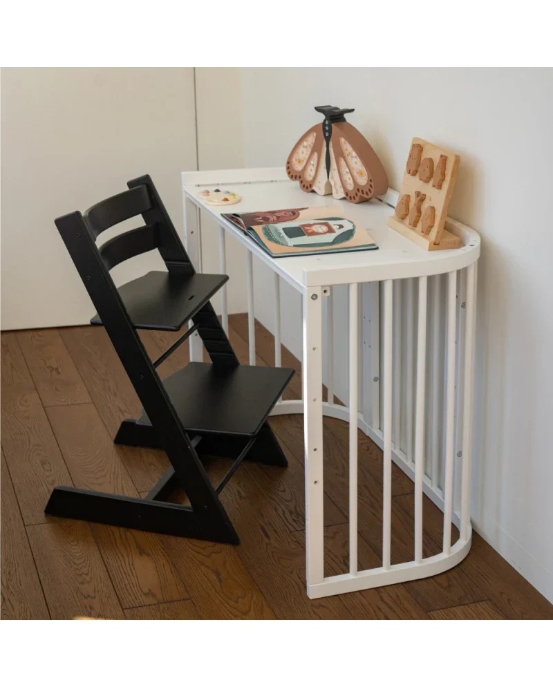 Das Babybett 5-in-1 in quadratischer Form löst dieses Problem mit einem klar durchdachten Konzept. Es vereint Babybett, Wiege, Beistellbett, Laufstall sowie Tisch mit Stühlen in einem stabilen System. In den ersten Wochen dient es als sicherer Schlafplatz direkt neben dem Elternbett. Die integrierte Schaukelfunktion unterstützt ruhige Einschlafmomente ohne zusätzliches Zubehör. Sobald dein Kind aktiver wird, verwandelst du das Bett in einen geschützten Laufstall. In der nächsten Phase entsteht daraus eine kleine Sitzgruppe für kreative Momente.