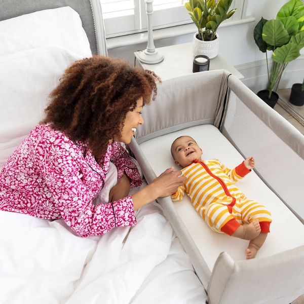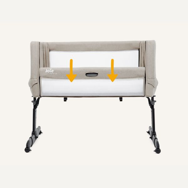 Dank der höhenverstellbaren Liegefläche lässt sich das Bett optimal an fast jedes Elternbett anpassen. Die Seitenwand ist mit einer Hand absenkbar und ermöglicht schnellen Zugang zum Baby – besonders in der Nacht ein großer Vorteil. Die Netzfenster auf beiden Seiten garantieren eine gute Luftzirkulation.